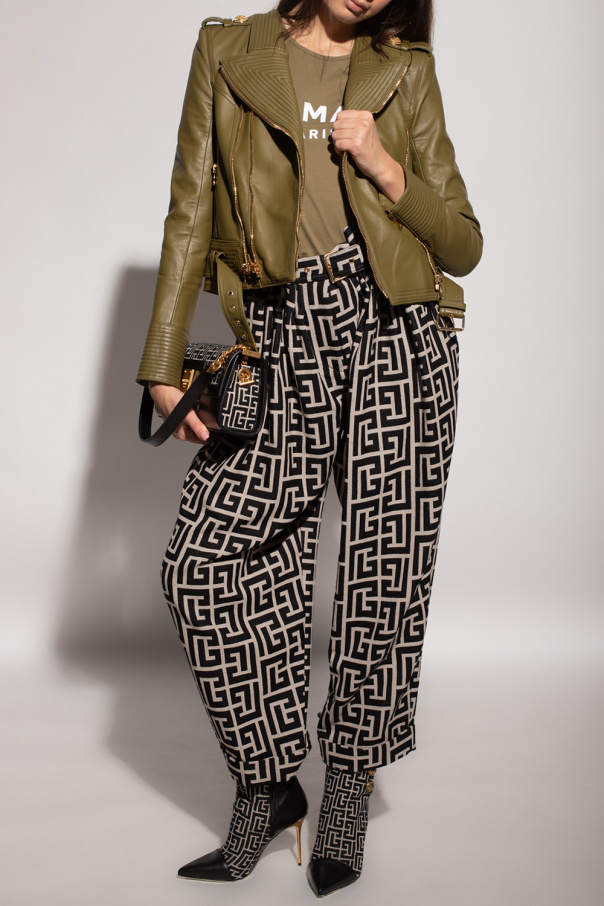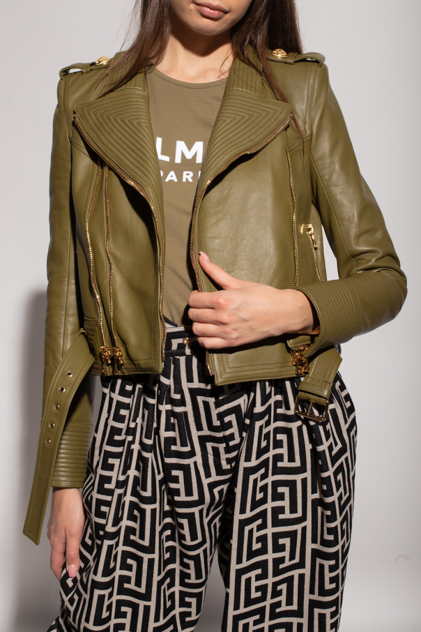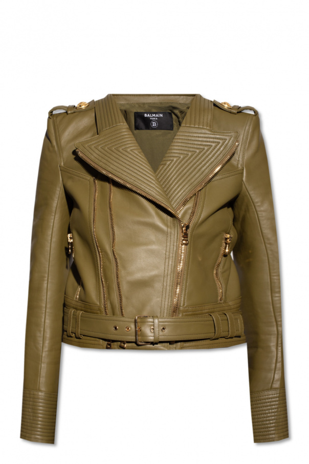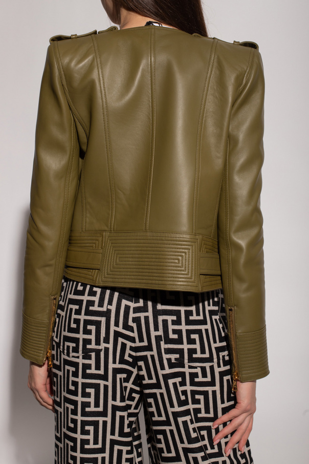 Green jacket from Balmain. Crafted from lamb leather, this style features a zip fastening, padded shoulders, two zipped pockets and long sleeves.