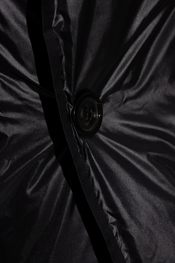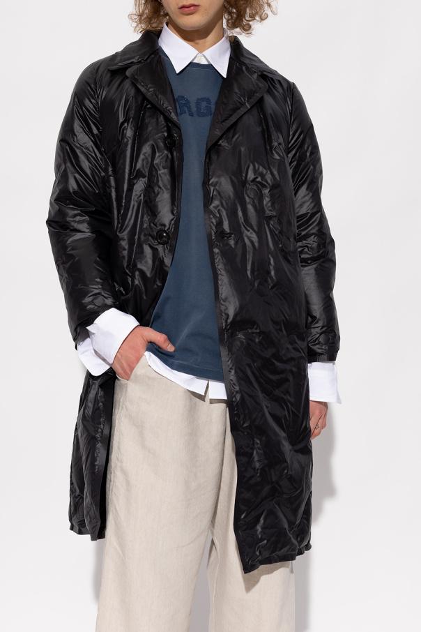 Black quilted coat from Maison Margiela. Fastened with buttons, this long sleeve design features a white logo embroidery at the back, two slip pockets and notch lapels.