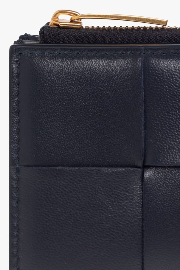 Navy blue folding wallet from Bottega Veneta. Crafted from lamb leather with the brand's signature ‘Intreccio’ pattern, this item features a snap fastening, one zip coin pocket, gold-tone metal hardware and one bill compartment, two slip pockets and six card slots inside.