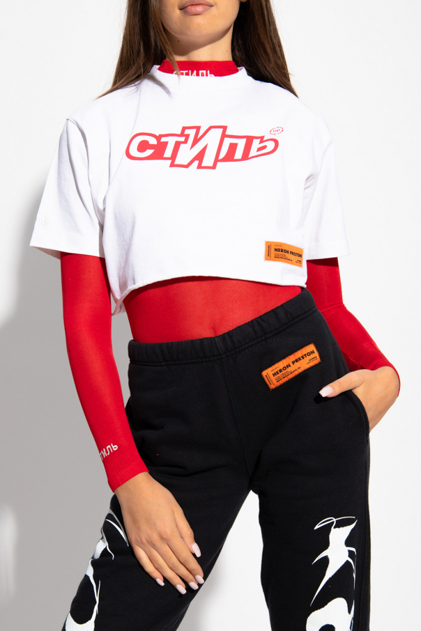 White cropped T-shirt from Heron Preston. Made of organic cotton, this short sleeve design features a red logo print, patches, raw-trimmed hem and short sleeves embroidered with a logo.