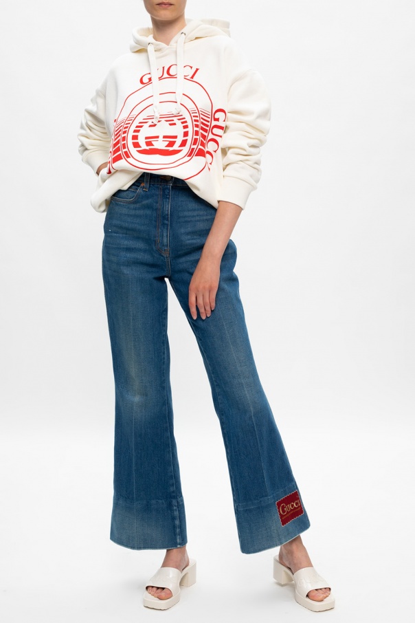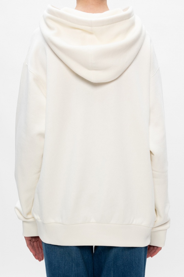 Cream hoodie from Gucci. Made of cotton, this long sleeve design features a red logo print, drawstring hood and ribbed trims.