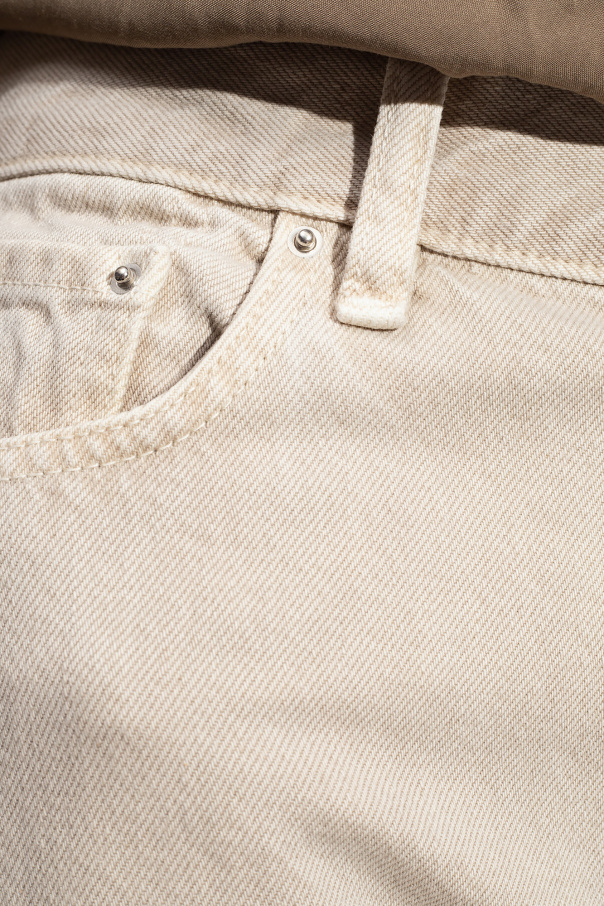Beige tapered jeans from Toteme. Fastened with a zipper and a button, this pair features a logo patch on the back, five slip pockets and long, wide legs.