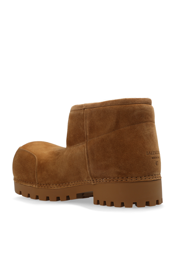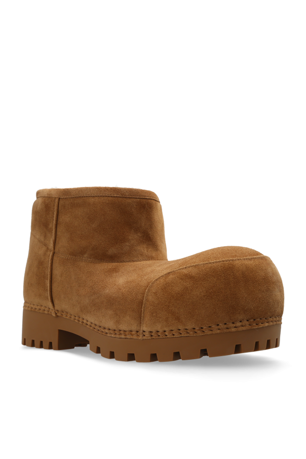 Introducing the exquisite Alaska Snow Boots from Balenciaga's exclusive women's collection. These ankle-high boots are a perfect blend of elegance and functionality, meticulously crafted to withstand the harshest winter conditions while exuding timeless style. Constructed from premium beige calfskin suede, these snow boots feature a robust, thick sole designed for unparalleled stability and comfort. The interior is luxuriously lined with plush white faux fur, ensuring that your feet remain warm and cozy, no matter how cold it gets outside. The anti-slip material of the thick sole enhances grip on slippery surfaces, providing added safety during winter strolls. A subtle brand inscription on the back adds a touch of sophistication, emphasizing the exclusivity of the product. Why Choose the Alaska Snow Boots? Exquisite design and high-quality materials for a luxurious feel Warm and cozy faux fur lining for ultimate comfort Thick, anti-slip sole for enhanced stability and safety Exclusive Balenciaga branding for a sophisticated touch Perfect for combining style with functionality during winter months