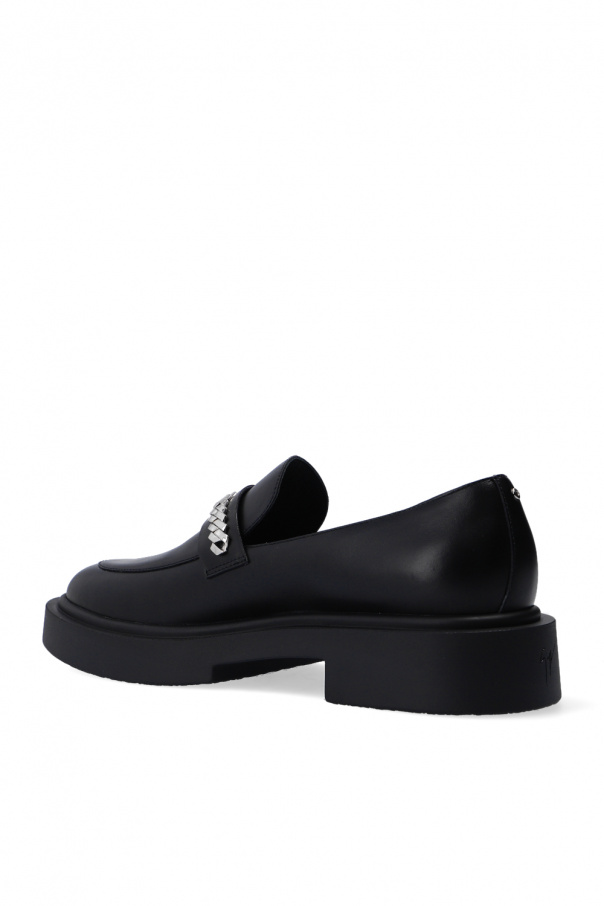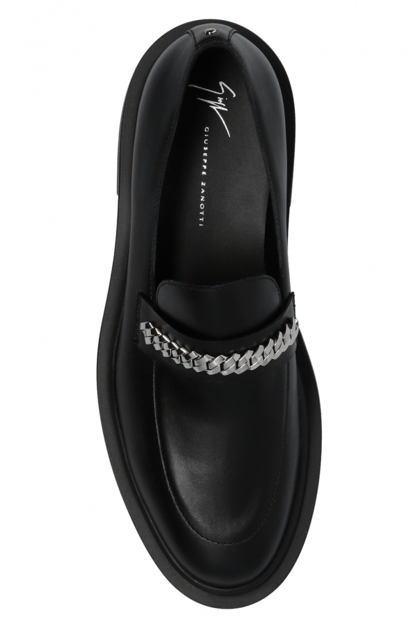 Black 'Achille Chain' moccasins from Giuseppe Zanotti. Made of leather, this pair sits on a black textured rubber sole and features silver-tone metal chain accessory and logo detail.