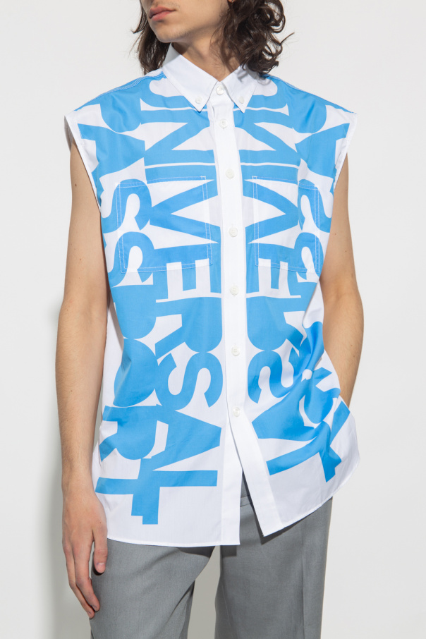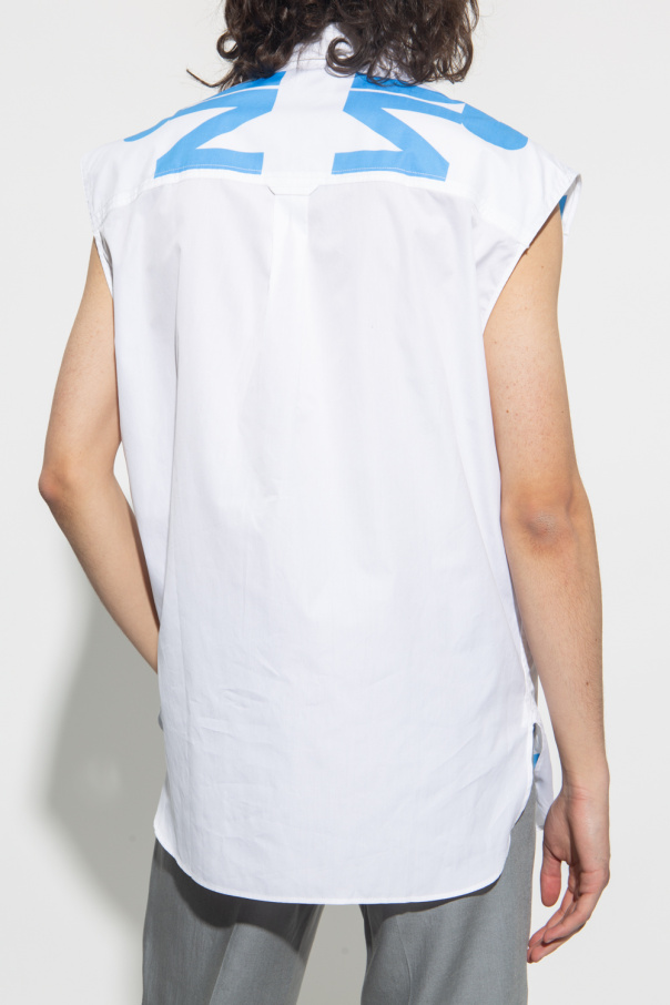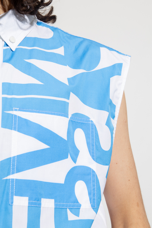 White sleeveless shirt from Burberry. Made of cotton, this style features mother-of-pearl button closures, two front slip pockets and a blue graphic print.
