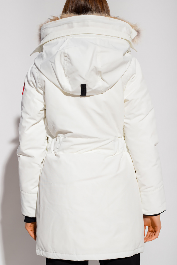 White and black ‘Trillum’ down jacket from Canada Goose. Emblazoned with logo patches, this style secures with a two-way zipper and snaps and features a drawstring hood with a detachable beige coyote fur insert, four pockets on the front – two with snap-fastened flaps, internal straps and long sleeves with elasticated cuffs.
