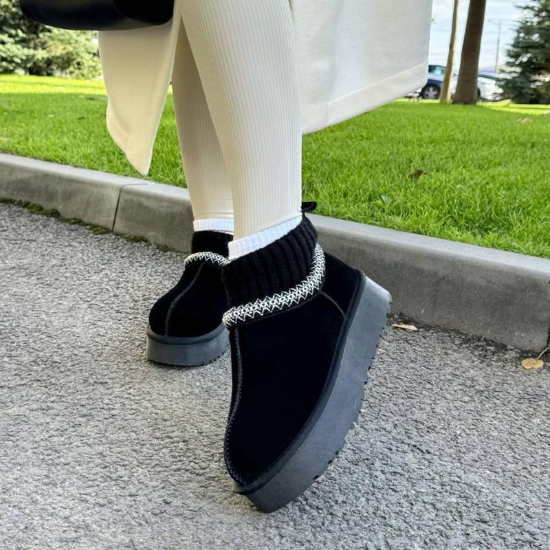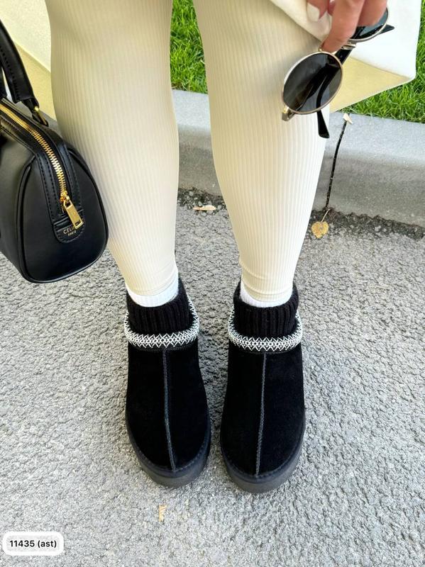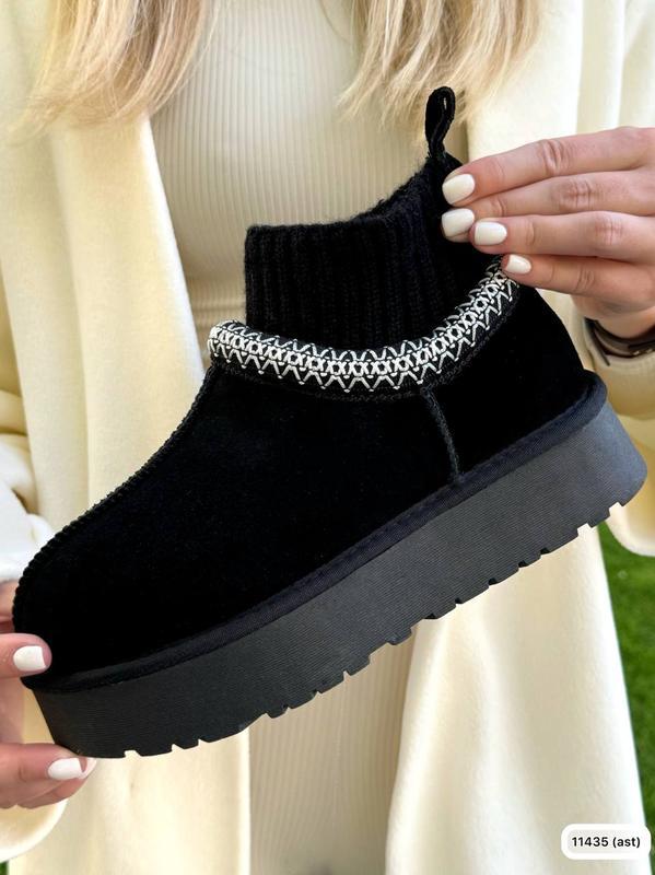 Высота от пятки: 7 см, с носком - 11 смЧерные низкие угги из натуральной замши. По верху украшены вышивкой и вязкой в виде носка. Середина и стелька - натуральный набивной мех. Сзади есть петелька для удобства обувания. Удобные и очень теплые.
