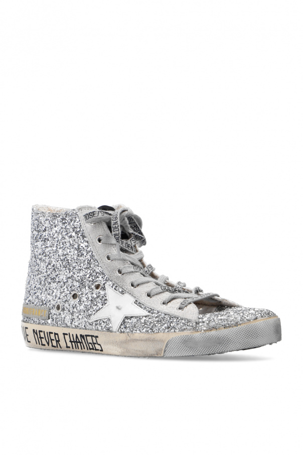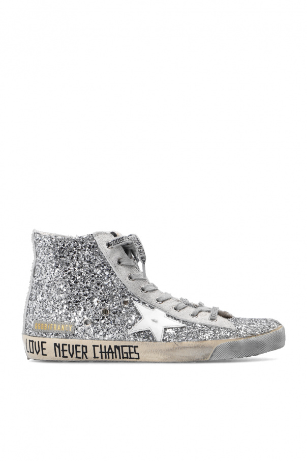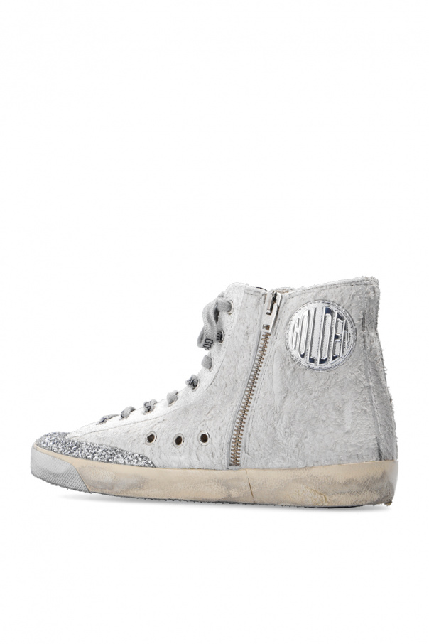 Grey and silver-tone ‘Francy Classic’ high-top sneakers from Golden Goose. Crafted from leather and fabric, this lace-up model sits on a white rubber sole and features a side zip fastening, a white patch and distressed effects.