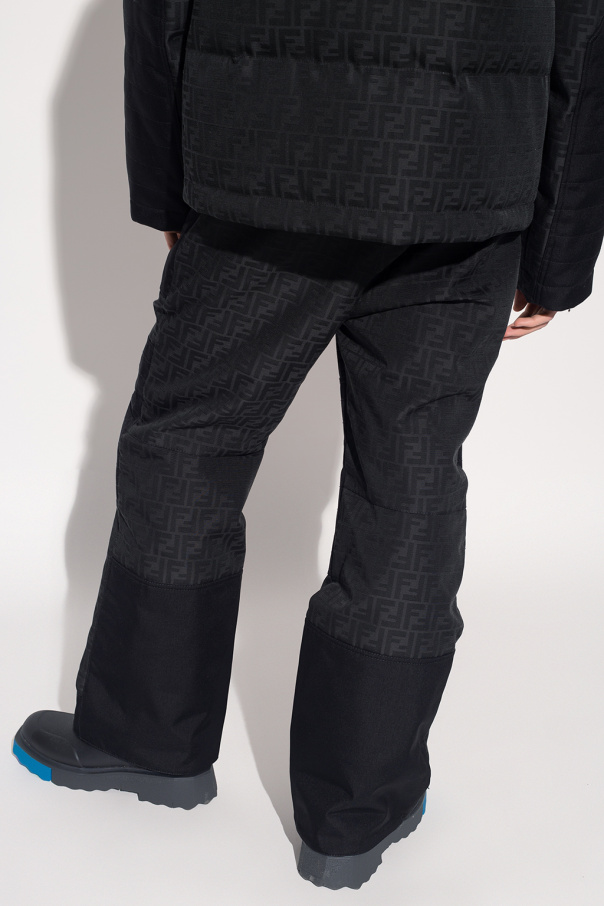 Black ski trousers from Fendi. Crafted from waterproof and windproof technical fabric with a high-waisted silhouette, this style showcases a black and grey jacquard ‘FF’ motif, a zip fly, snap closures, side adjusters, two zipped pockets and elasticated cuffs.