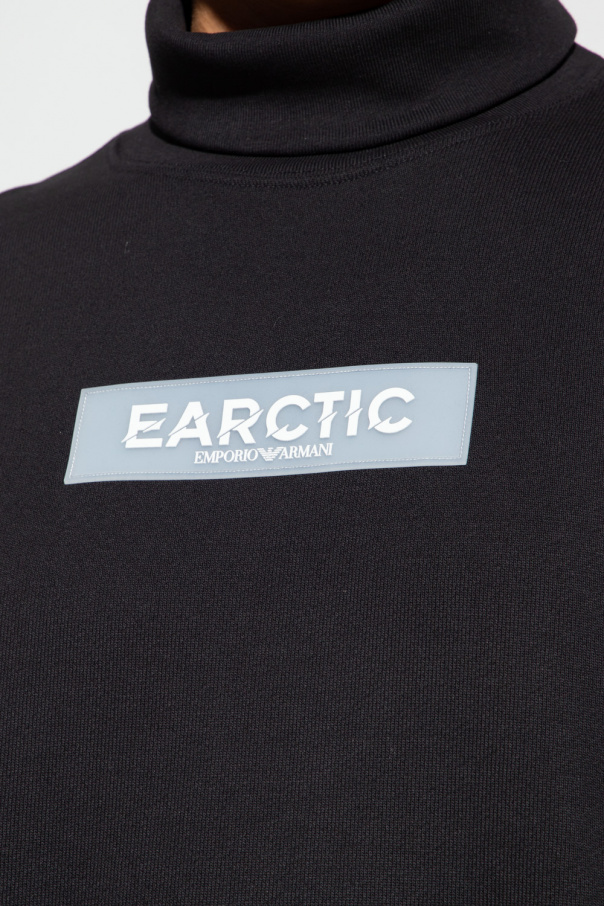 Black sweatshirt with a high neck from Emporio Armani, the ‘Sustainable’ collection. Made of 100% recyclable cotton and elements, this long sleeve design features ribbed trims and rubberised logo print in white and grey.
