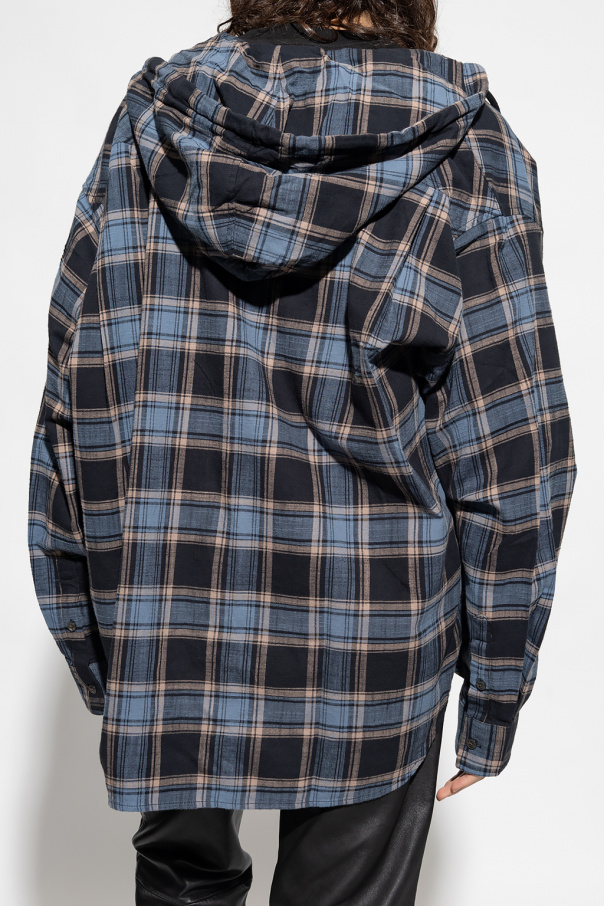 Navy, blue and beige ‘S-DEWNY’ shirt from Diesel. Crafted from cotton, this design features button fastenings, a check pattern, logo embroidery, drawstring hood, front pocket and long sleeves with buttoned cuffs.