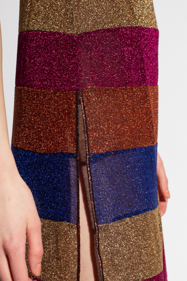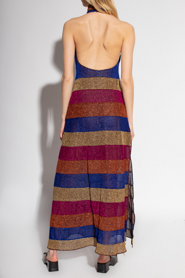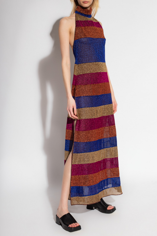 Multicoloured turtleneck dress from Oseree. Inlaid with lurex yarn, this style features a stripe pattern, a snug collar with button closures, a side slit and a denuded back.