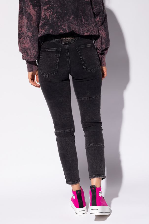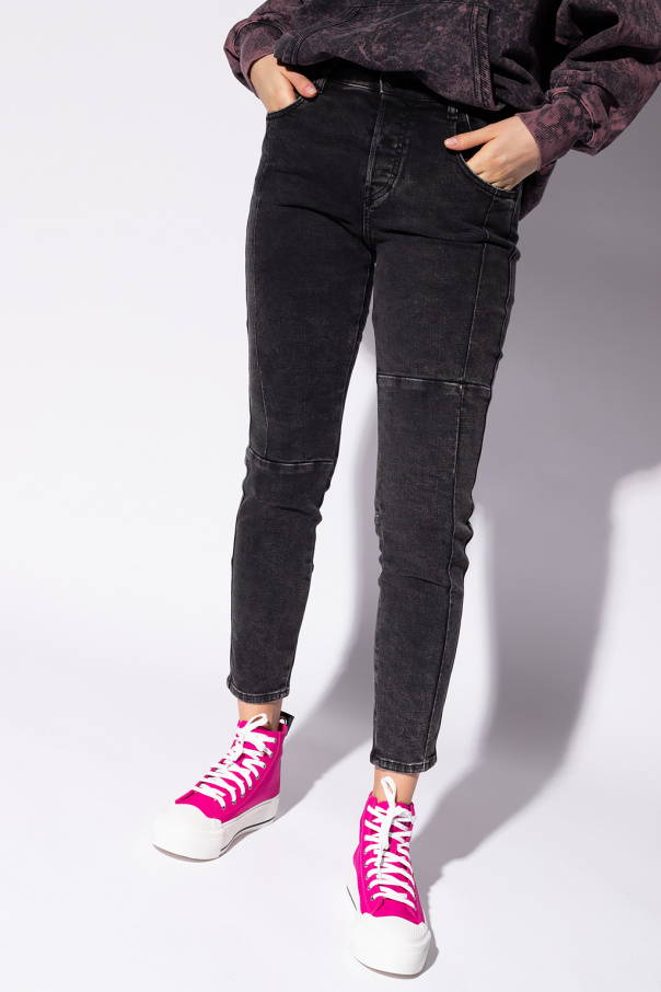 Black ‘Babhila’ jeans from Diesel. Fastened with buttons, this tapered leg design features contrasting stitching, four front pockets as well as two pockets with a logo embroidery at the back.