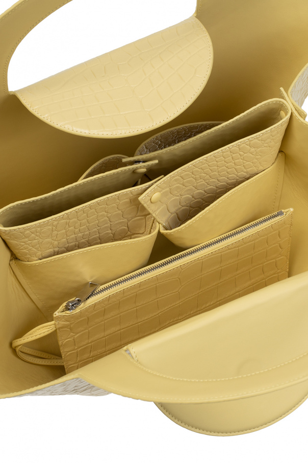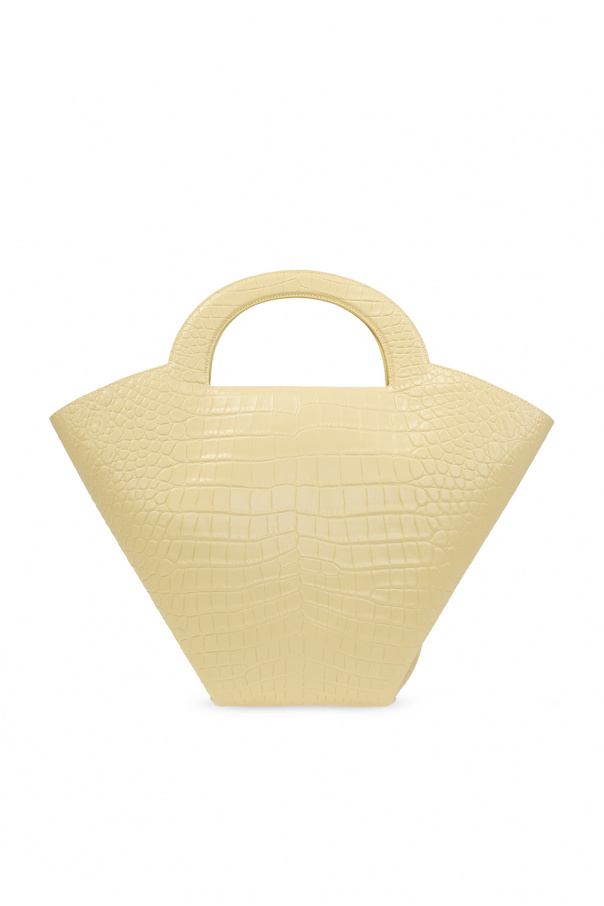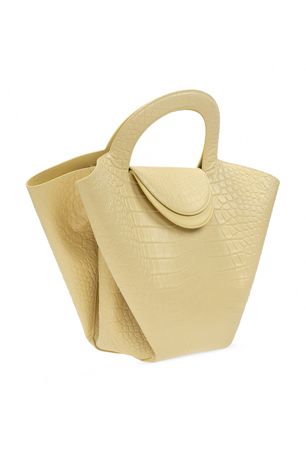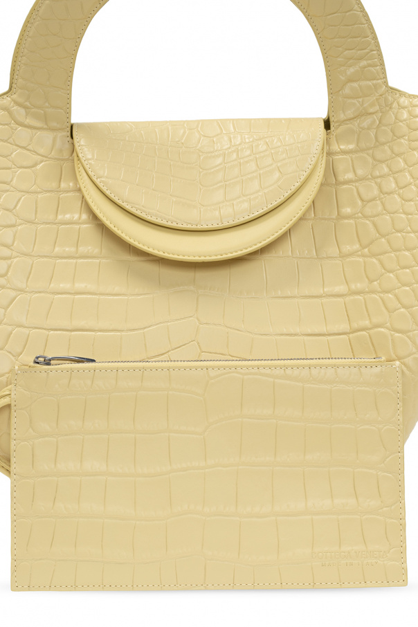 Yellow ‘Doll’ hand bag from Bottega Veneta. Crafted from calf leather with a crocodile skin effect, this design features a magnetic closure, two half-round handles and one internal compartment with a detachable zipped pouch.