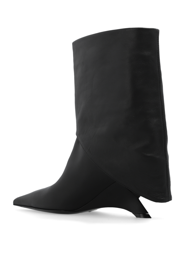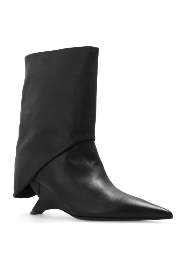 Black ‘Swam’ heeled boots from Vic Matie. Made of leather, this pair rests on a black leather sole and features a decorative heel with a panel.