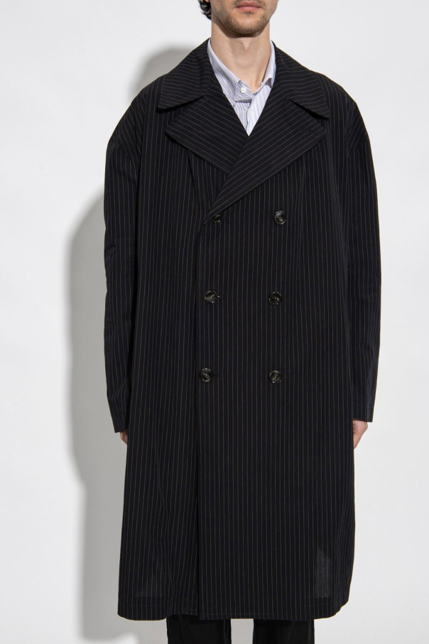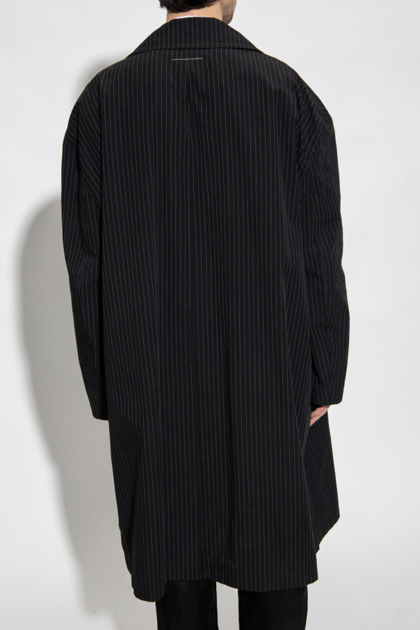 Black oversize double-breasted coat from MM6 Maison Margiela. Made of cotton, this garment features button fastenings, white pinstripe pattern, two slip pockets, single rear vent, notch lapels and long sleeves.