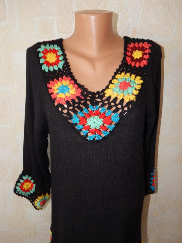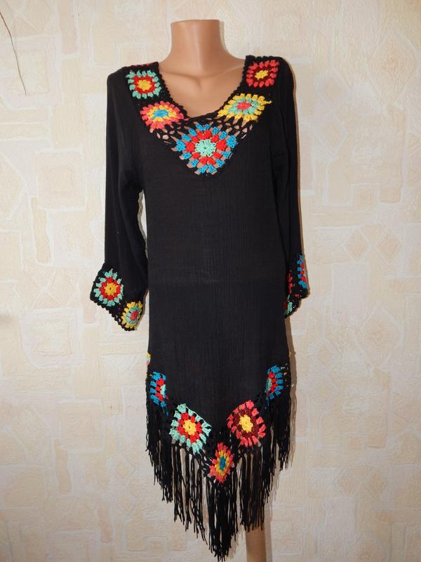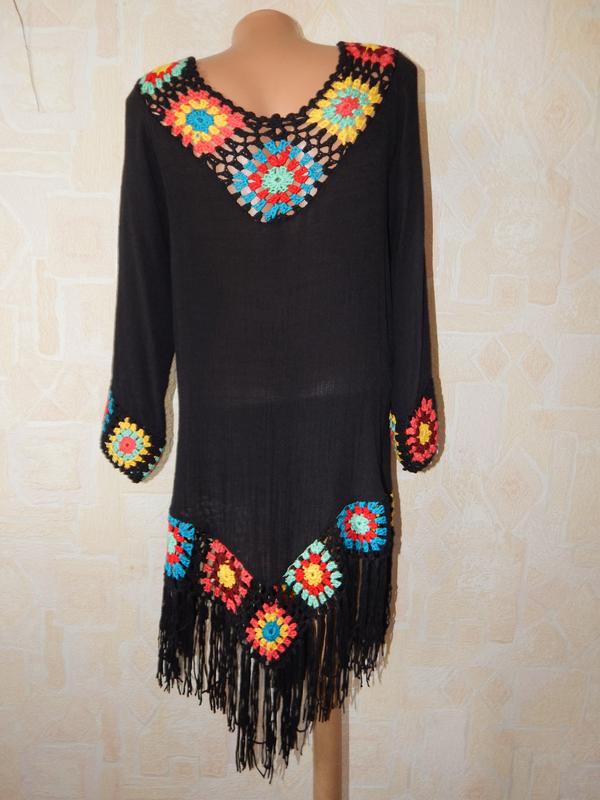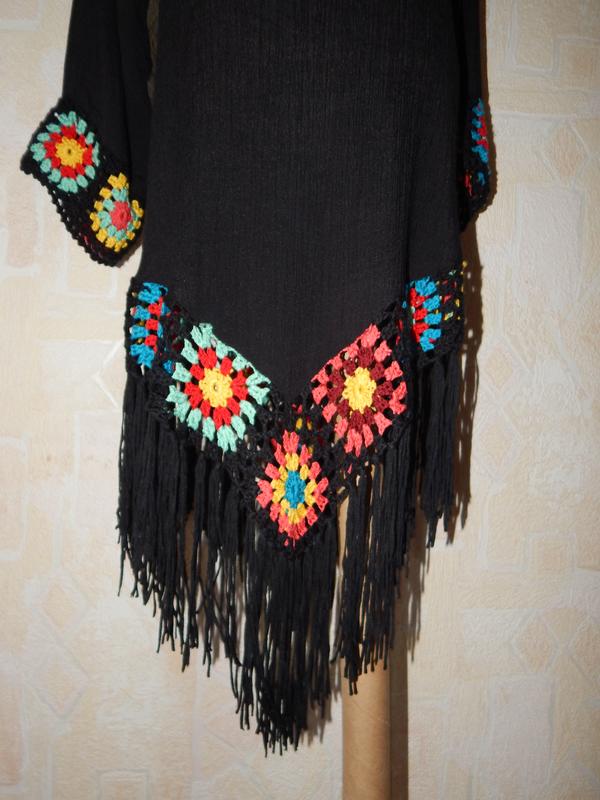 Реглан, по горловине, низу и рукавам, ткань жатка, кружевные вязаные крючком разноцветные квадраты и длинная густая бахрома внизу. Подмышками 51-54см, рукав от горловины 62см, длина через грудь 79 в т. ч. бахрома 20см, низ 65см. Простая нить на квадратах и вискоза ткань.