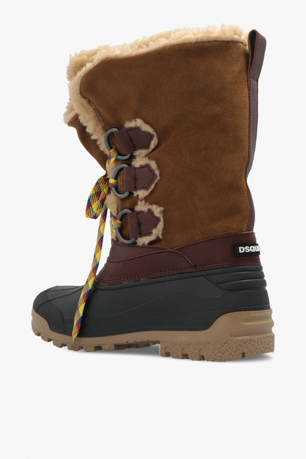 Brown and black ‘Wood Lover Duck’ lace-up snow boots from Dsquared2. Resting on a brown rubber sole, this lace-up pair features a leather, suede and rubber upper, faux fur lining and multicolored logo patches.