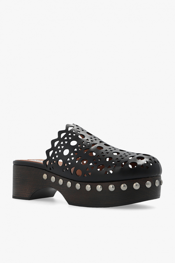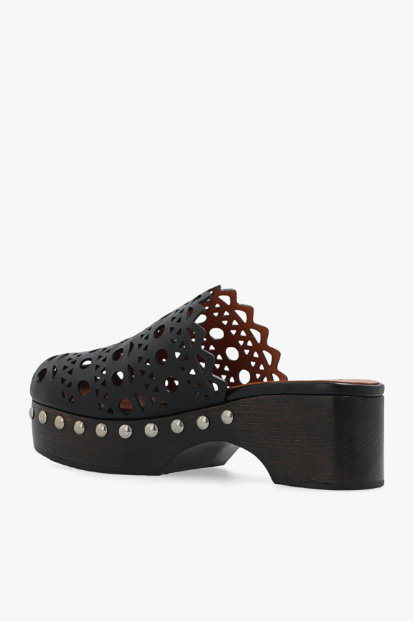 Black clogs from Alaia. Crafted from calf leather, this pair features a cut-out pattern, silver-tone studs and dark brown wood sole with rubber trims.