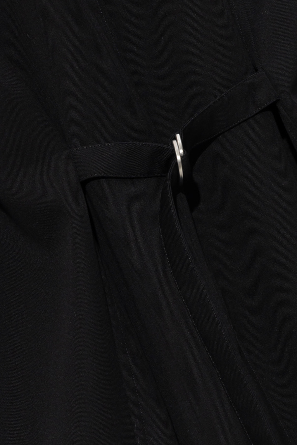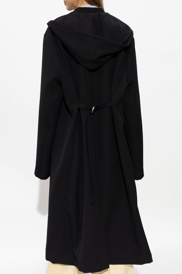 Black coat from JIL SANDER. Made of wool with an oversize fit, this style fastens with buttons and features a detachable drawstring hood, two slip pockets, long sleeves as well as a belted waist and a single back vent.