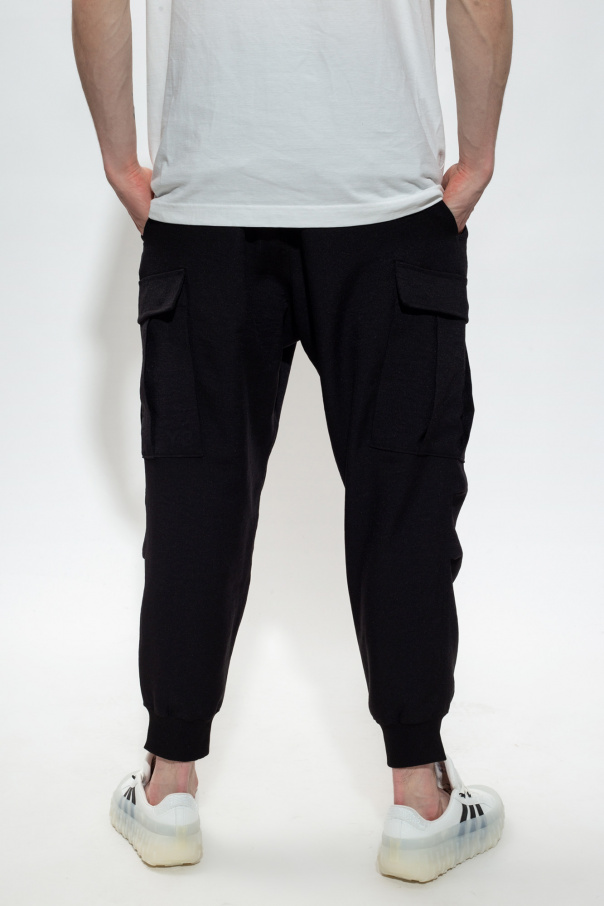 Black cargo trousers from Y-3 Yohji Yamamoto. Fastened with a zip and button, this pair features an elastic waistband with drawstrings, two slip pockets, ribbed cuffs, two slip pockets on the front as well as two snap-fastened front and back pockets.