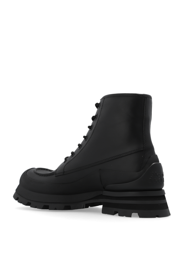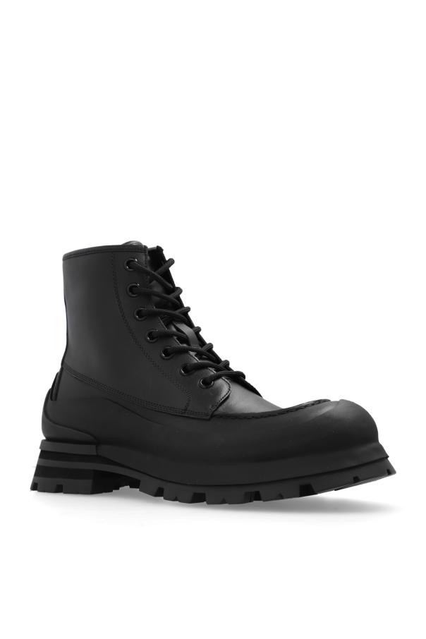 Black ‘Wander’ ankle boots from Alexander McQueen. Crafted from leather and trimmed with rubber, this lace-up model sits on a black rubber sole and showcases a tactile logo at the back.