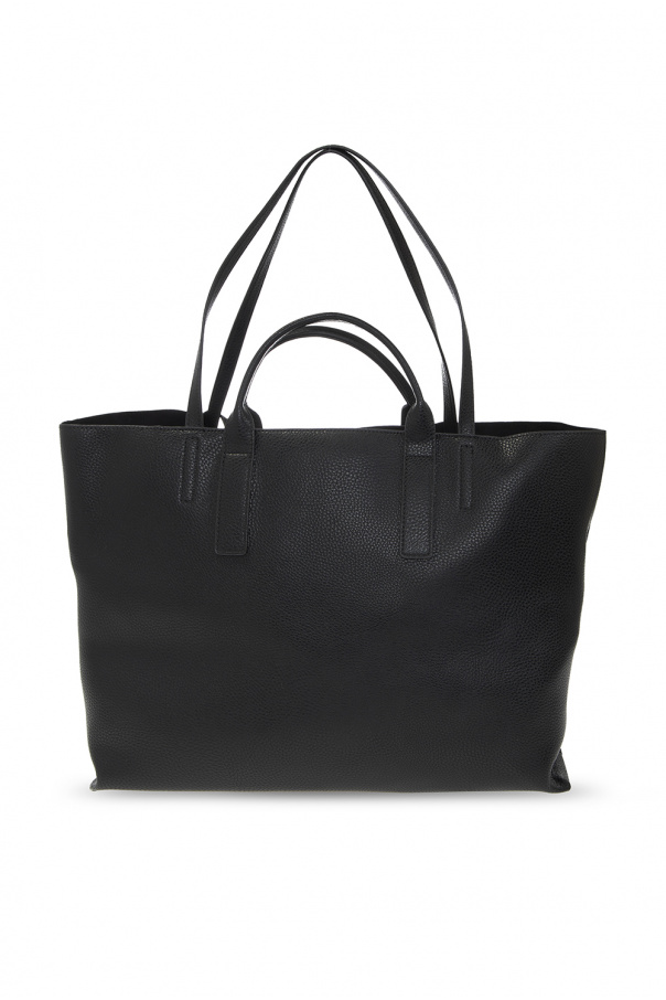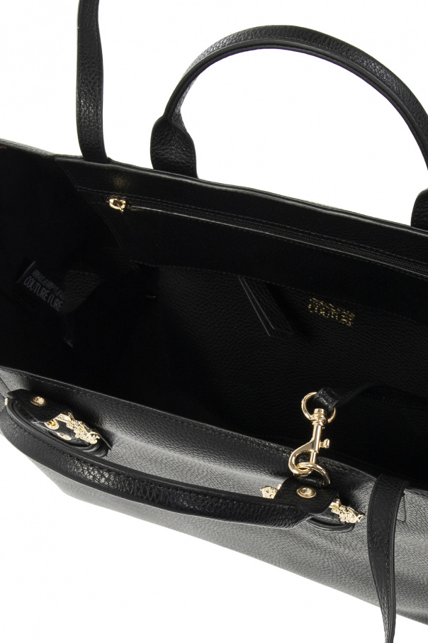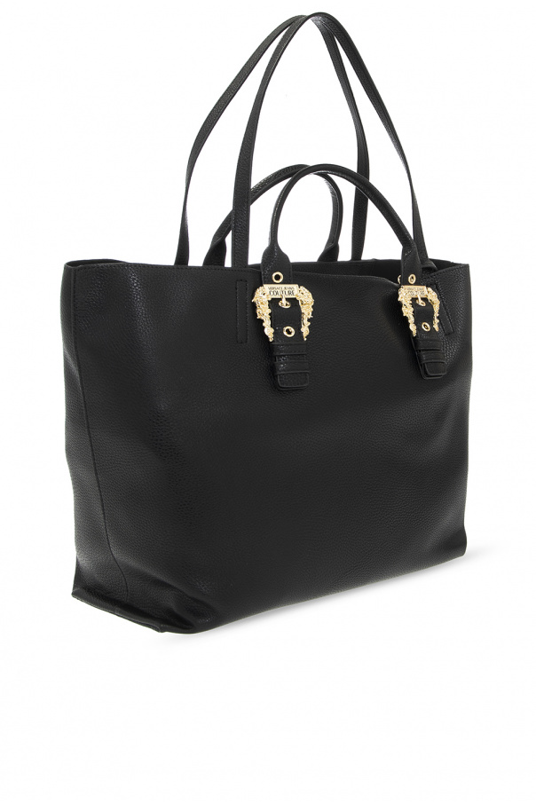 Black shopper bag from Versace. This design features metal logo-embossed buckles in gold-tone, two half-round straps and handles as well as one internal compartment with one zip pocket and a removable zipped pouch.
