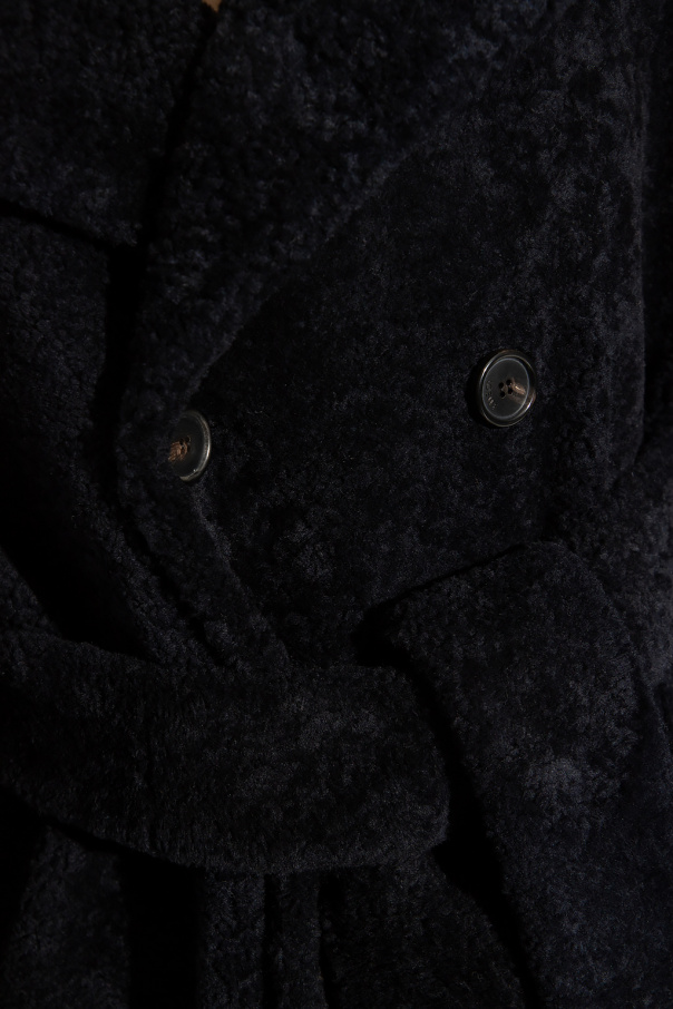 Navy blue and black double-breasted shearling coat from Loewe. Crafted from lamb leather, this style features button fastenings, notch lapels, a waist-cinching belt, two slip pockets and long sleeves.