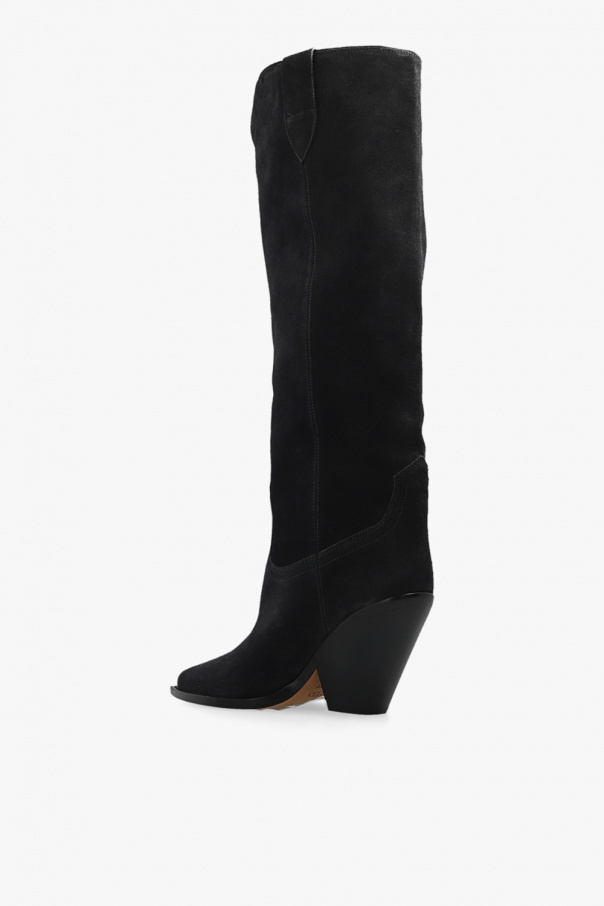 Navy ‘Lomero’ heeled boots from Isabel Marant. Made of suede, this design features decorative stitching and beige leather sole.