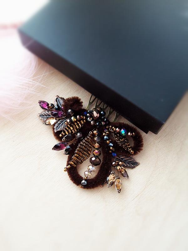 Версаль - авторский дизайнерский гребень станет ярким штрихом для праздничной причёски. Идеально подойдёт к бархатному платью или к наряду с меховым декором. Нежный, изысканный, необычный, привлекающий внимание. Сочетание хрустальных бусин, кристаллов, фурнитуры цвета бронзы и бархатных элементов - создаёт неповторимую композицию в духе роскошного Версаля - резиденции французских королей.
