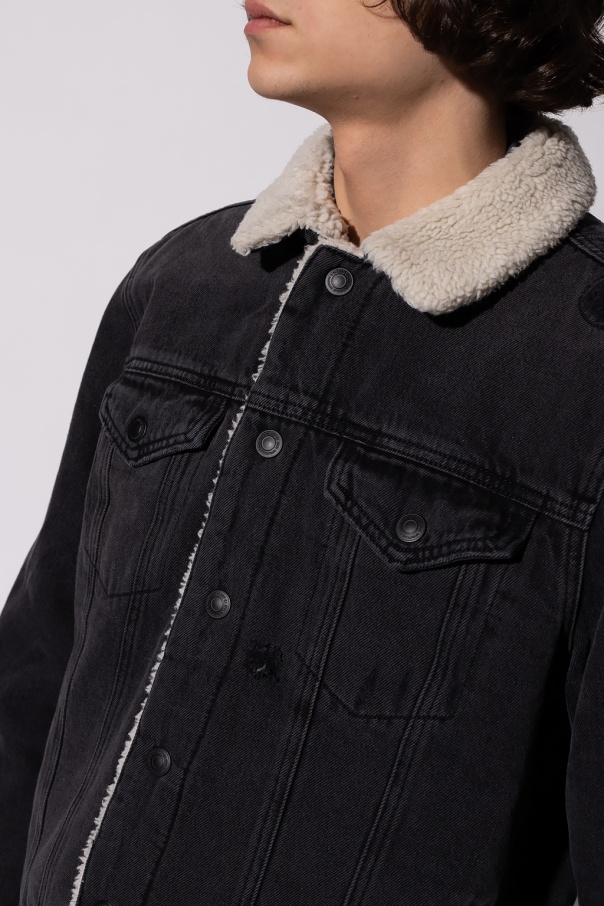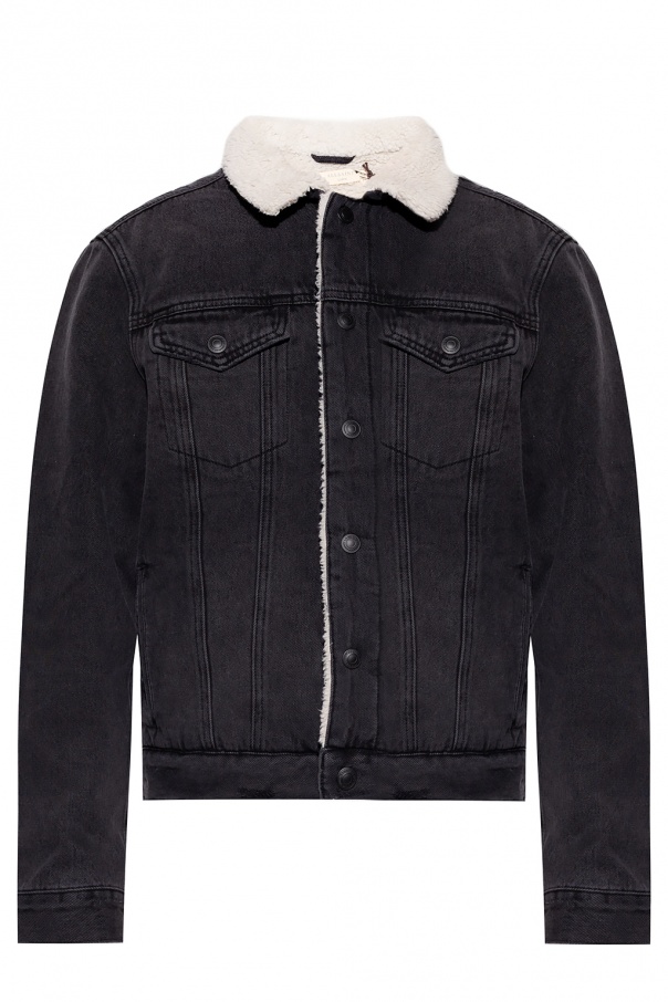 Black ‘Morton’ denim jacket from AllSaints. Crafted from cotton, this item fastens via snaps and features two side welt pockets, two flapped chest pockets with buttons and a cream fur-like lining.