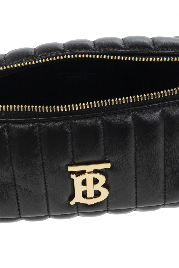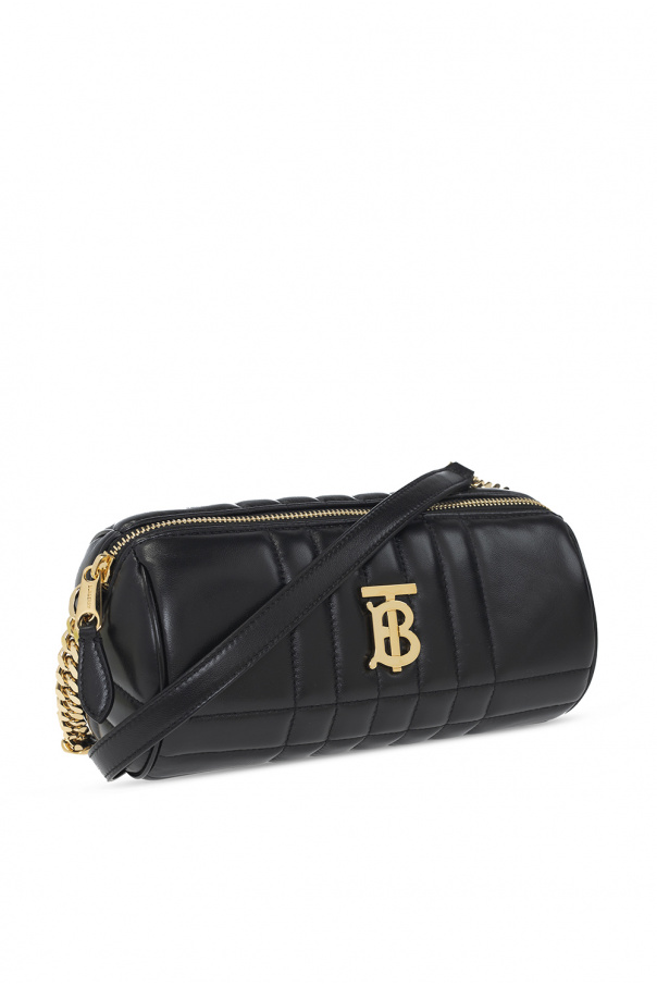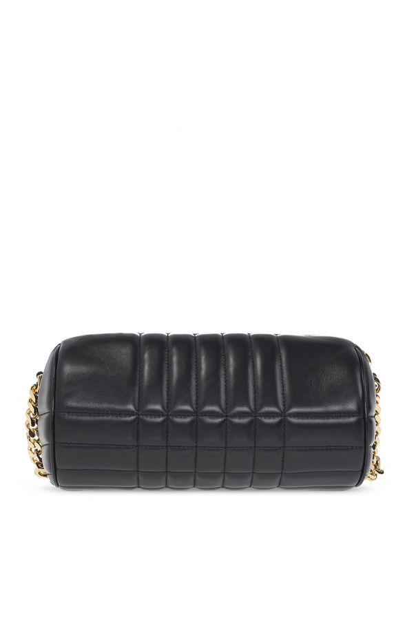 Black ‘Barrel’ quilted shoulder bag from Burberry. Made of calf leather, this design features a zip fastening, a metal logo plaque on the front, a long chain and leather shoulder strap, gold-tone metal hardware and one internal compartment.