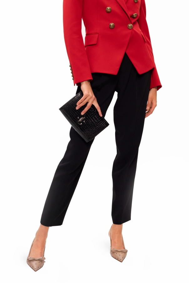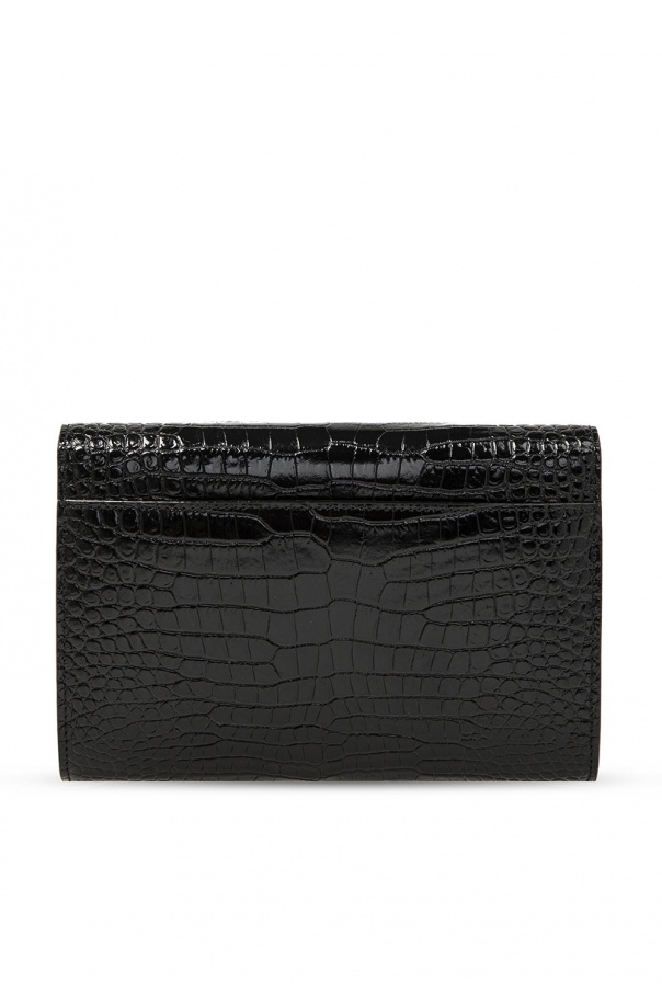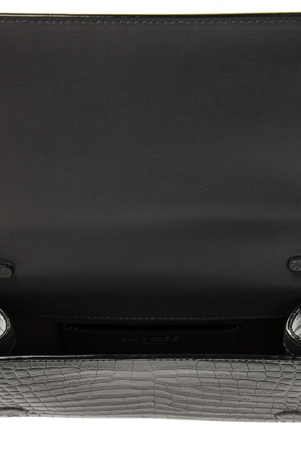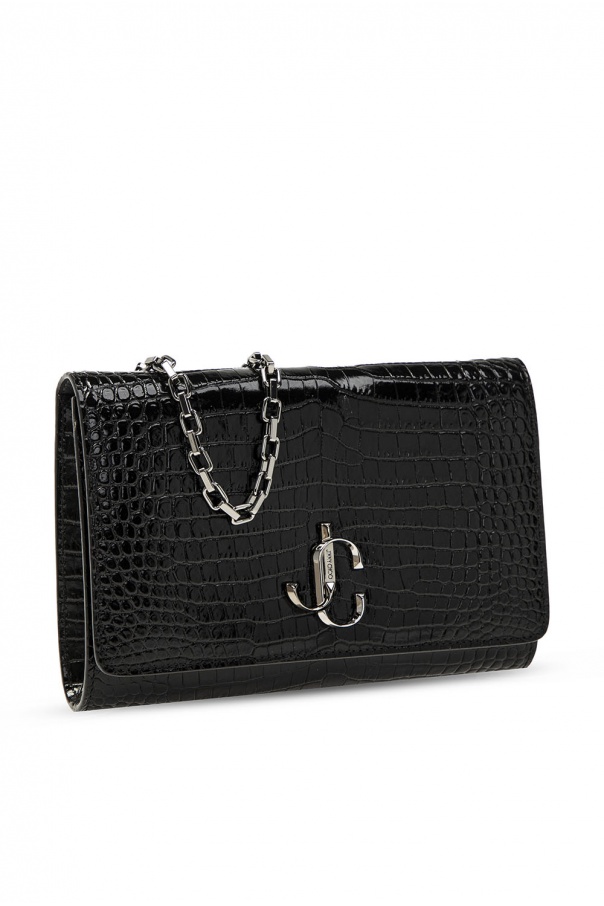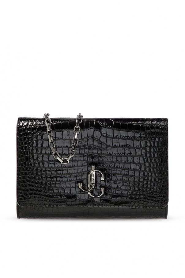 Black ‘Varenne’ shoulder bag from Jimmy Choo. Made of textured leather. Magnetic closures. Front decorated with a metal logo applique. Slip pocket at the back. Removable chain shoulder strap. Main internal compartment with a card slot. Silver-tone metal hardware.