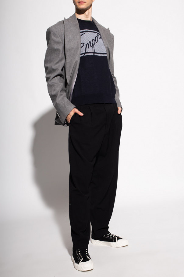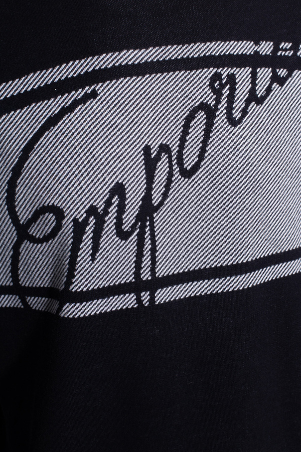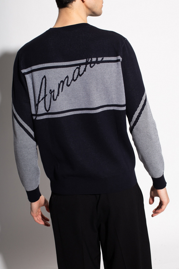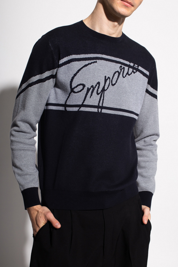 Navy and white sweater from Emporio Armani. Crafted from cotton, this long-sleeve design features a round neck and a logo embroidery.