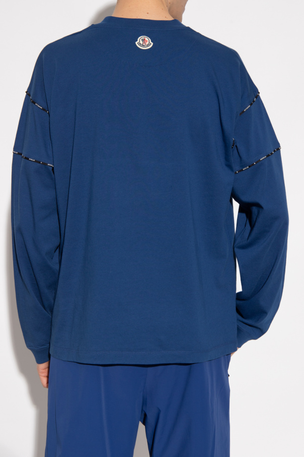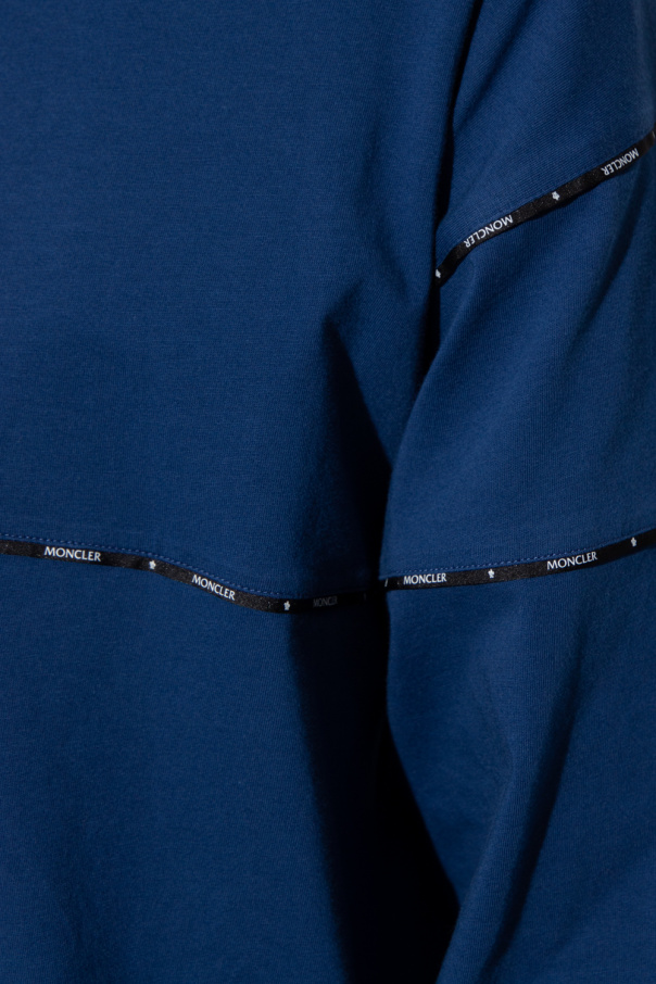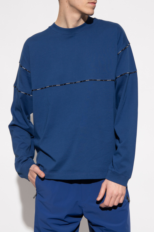 Navy blue crewneck T-shirt with long sleeves from Moncler. Made of cotton, this style showcases an elasticated collar and cuffs and black piping with a printed white logo.