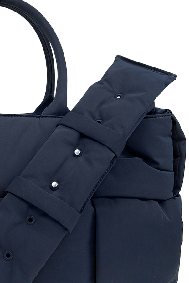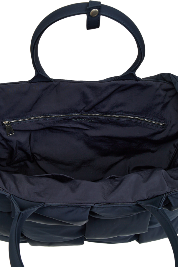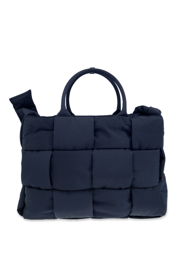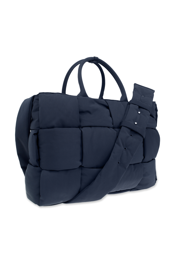 Navy ‘Arco Large’ shopper bag from Bottega Veneta. Made of recycled materials with the iconic Intrecciato weave, this model features a logo print, two half-round handles, adjustable strap, gold-tone metal hardware and one internal compartment with one zip pocket and two slip pockets.