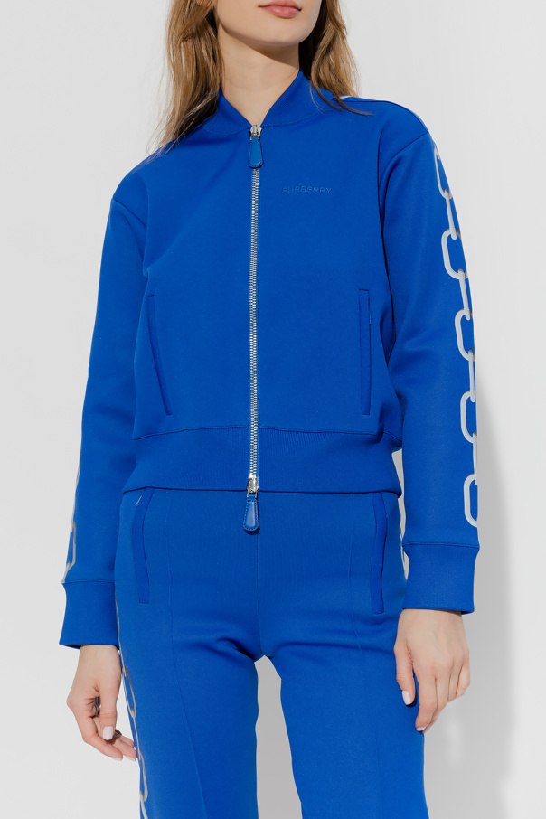 Blue ‘Regina’ sweatshirt from Burberry. Fastened with a two-way zip, this garment features a logo embroidery, chain link print, two front zip pockets and ribbed trims at the hem and cuffs.