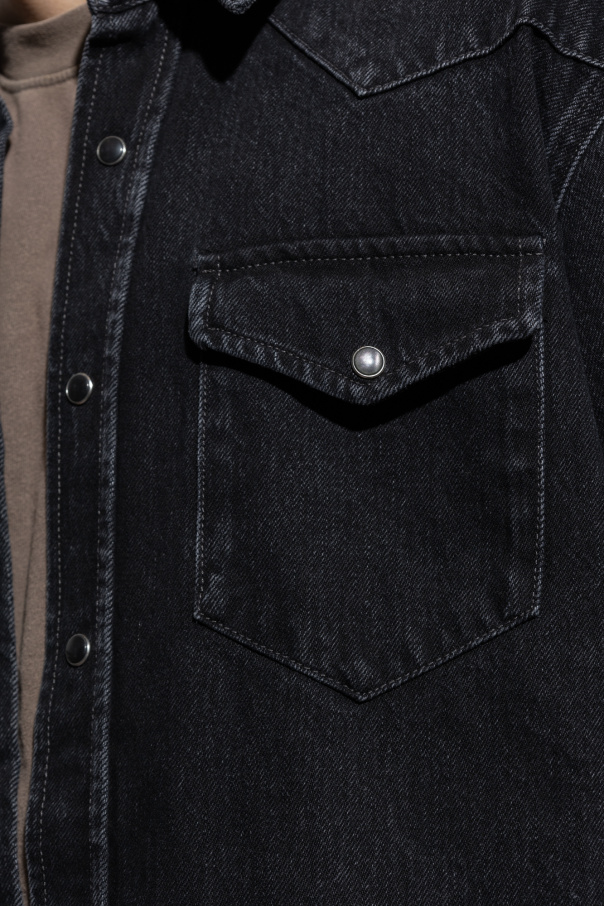Black denim shirt from Acne Studios. Cut with a relaxed fit, this style fastens with pearly buttons and features a collared neckline, two flapped chest pocket and long sleeves with snap-fastened cuffs.