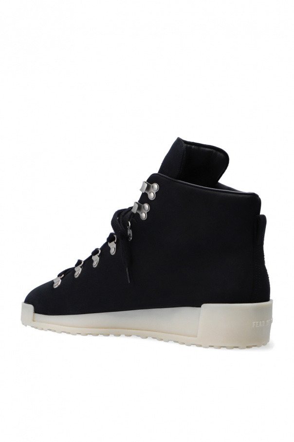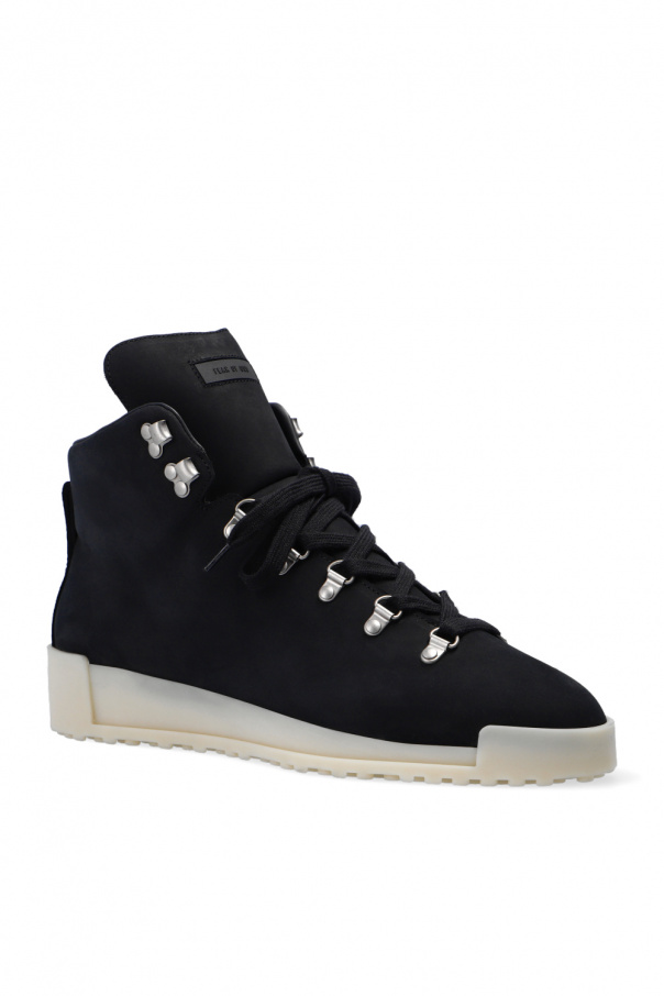 Black ‘7th Hiker’ boots from Fear Of God. Crafted from nubuck, this lace-up design features a rubber tongue appliqué with a logo, cream rubber sole and an additional pair of red laces.