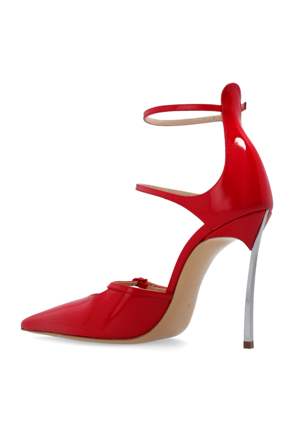 Red ‘Superblade Rachel’ pumps from Casadei. Made of patent leather, this design features adjustable buckle straps, a pointed toe, silver-tone stainless steel heel and beige leather sole.