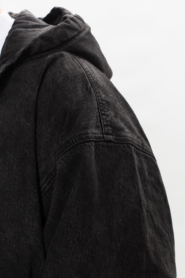 Black and grey hooded denim jacket from Balenciaga. Fastened with a zip, this design has two snap-fastened flap pockets, long sleeves with pockets and an elasticated hem.