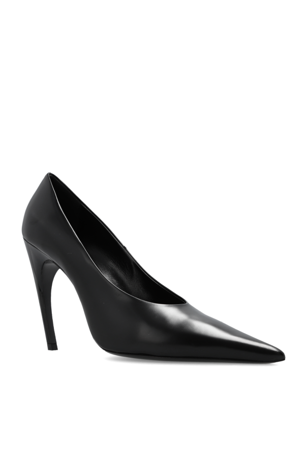 Black stiletto pumps from Nensi Dojaka. Made of leather, this pair features a pointed toe, decorative curved heel and black leather sole.