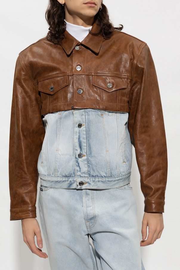 Brown and light blue jacket from VTMNTS. Crafted from leather and cotton, this garment features button fastenings, four slip pockets, two buttoned flap pockets, detachable denim panel and long sleeves with padded shoulders and buttoned cuffs.