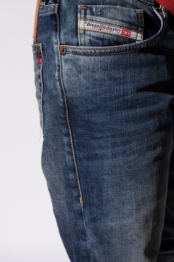 Navy ‘G-Strukt’ jeans from Diesel. Crafted from cotton, this tapered leg design is complete with zip and button fastening, five slip pockets, beige and maroon logo patch and a worn effect.