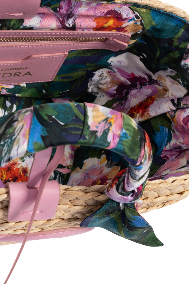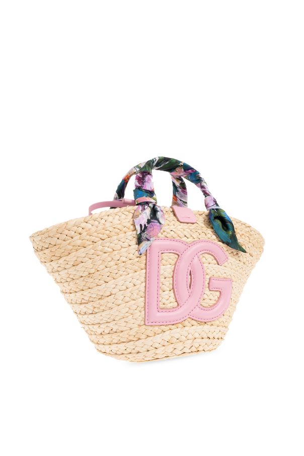 Beige ‘Small Kendra’ handbag from Dolce & Gabbana. Made of straw, this design secures via a leather lace and features a pink logo patch, two half-round colourful handles and one internal compartment with one slip pocket and one zip pocket.