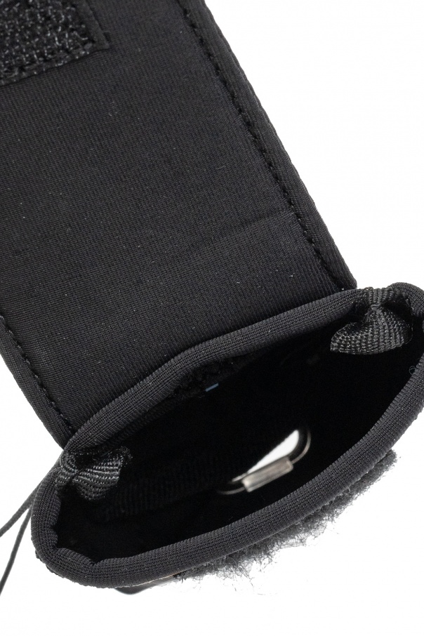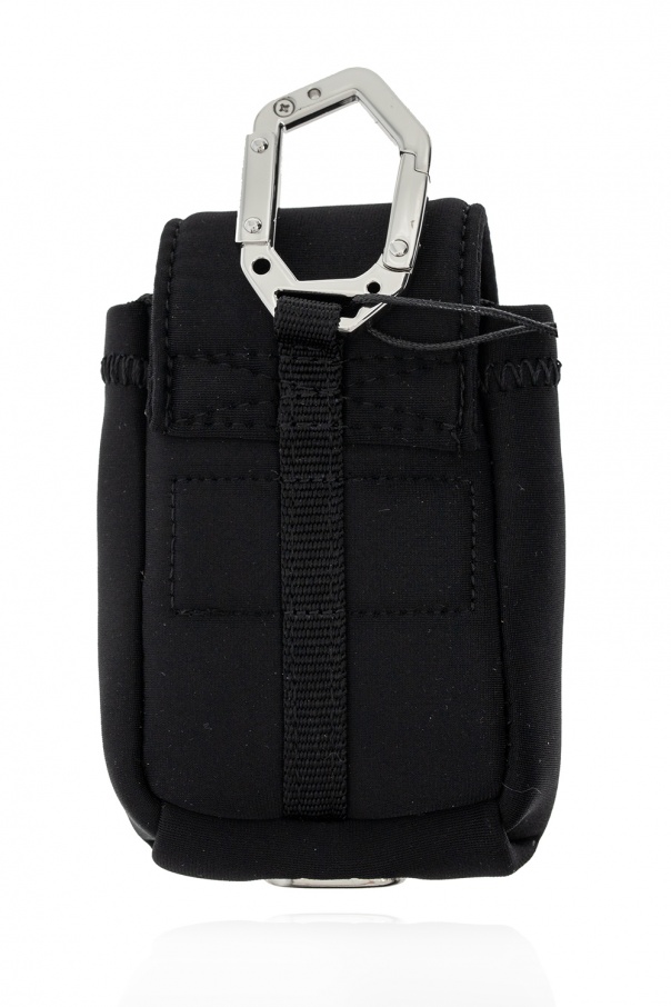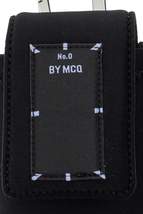 Black earphones case from No. 0 by MCQ. Fastened with velcro, this item features a light blue logo patch, detachable clip and shoulder strap as well as one internal compartment and silver-tone metal hardware.