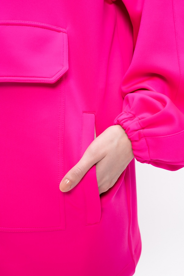 Neon pink hoodie from Gucci. This design features a drawstring hood, side zip, beige logo patch, flap pocket, two zip pockets and a drawstring hem.