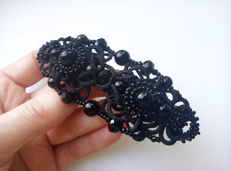 Кружевная заколка в чорном цвете выполнена в технике фриволите, анкарс из полиэстровых ниточек и расшита хрустальными бусинами и чешским бисером. Заколка-автомат. Длина 9,5 см, ширина 4 см. Авторский дизайн. Черная заколка автомат ручной работы. Заколка фриволите анкарс из бусин и бисера сделает ваш образ притягательным, неотразимым и загадочным. Возможен повтор и исполнение в другом цвете. Авторские кружевные украшения фриволите, анкарс из ниток. Вязанная бижутерия хенд мейд. Дизайнерские украшения из кружева анкарс ручной работы