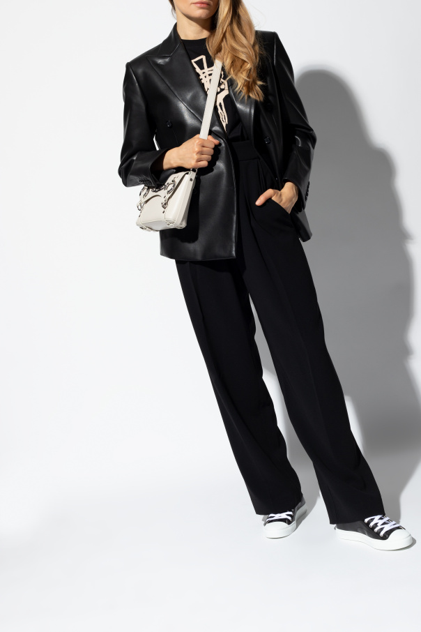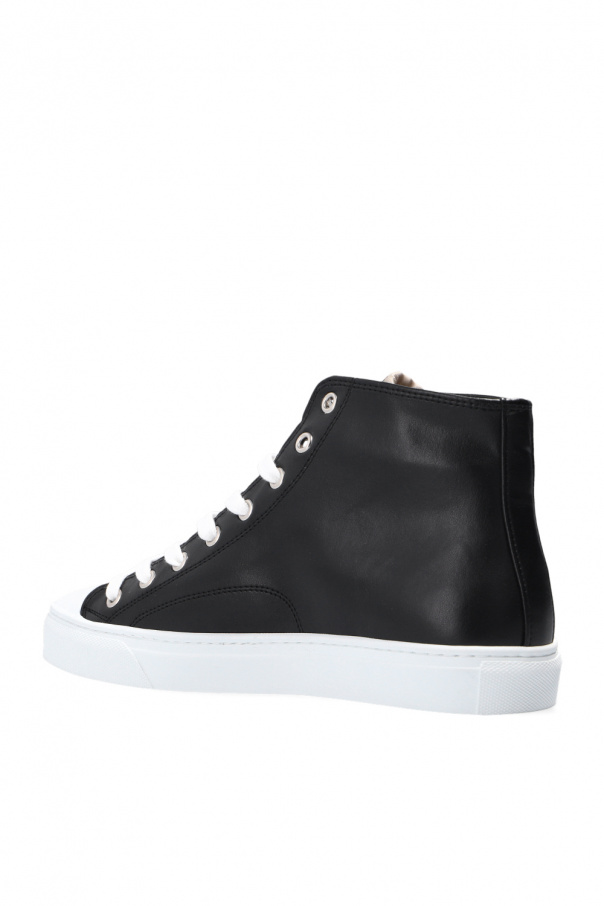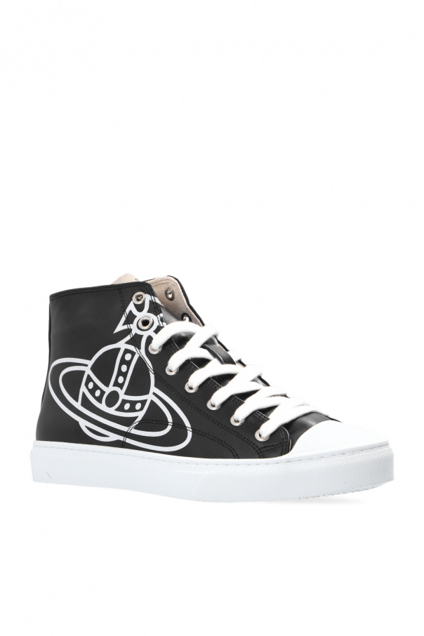 Black sneakers from Vivienne Westwood. Made of vegan leather, this lace-up pair is decorated with a printed logo pattern in white and rests on a white rubber sole.