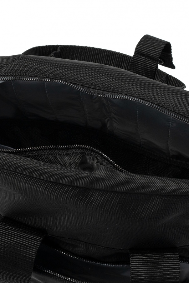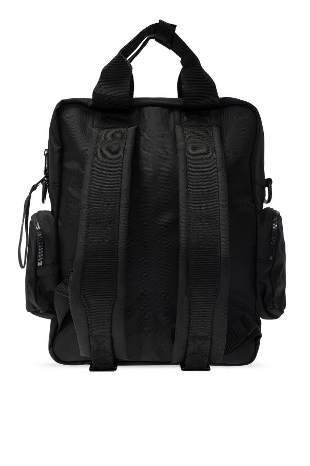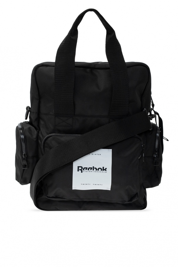 Black backpack from Reebok x Victoria Beckham. Boasting and black and white logo, this design fastens via two-way zip and employs an external zipped pocket on the front, two zipped pockets on the side, two half-round handles, an included shoulder strap, adjustable shoulder straps, black metal hardware and silver-hued interior with one compartment and one slip pocket.